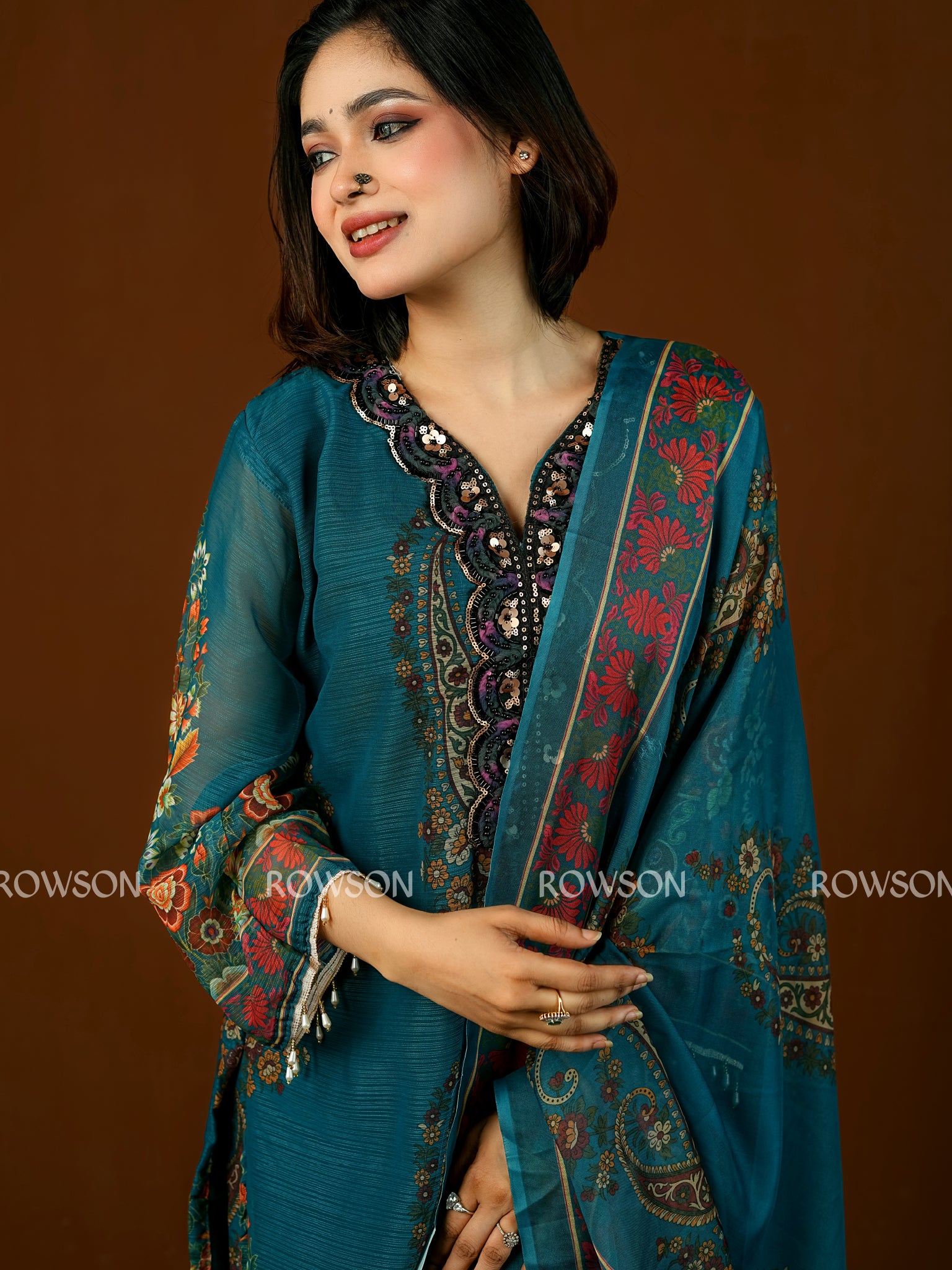 ⎆ Digitally printed dupatta & matching printed trouser with coordinated ethnic motifs