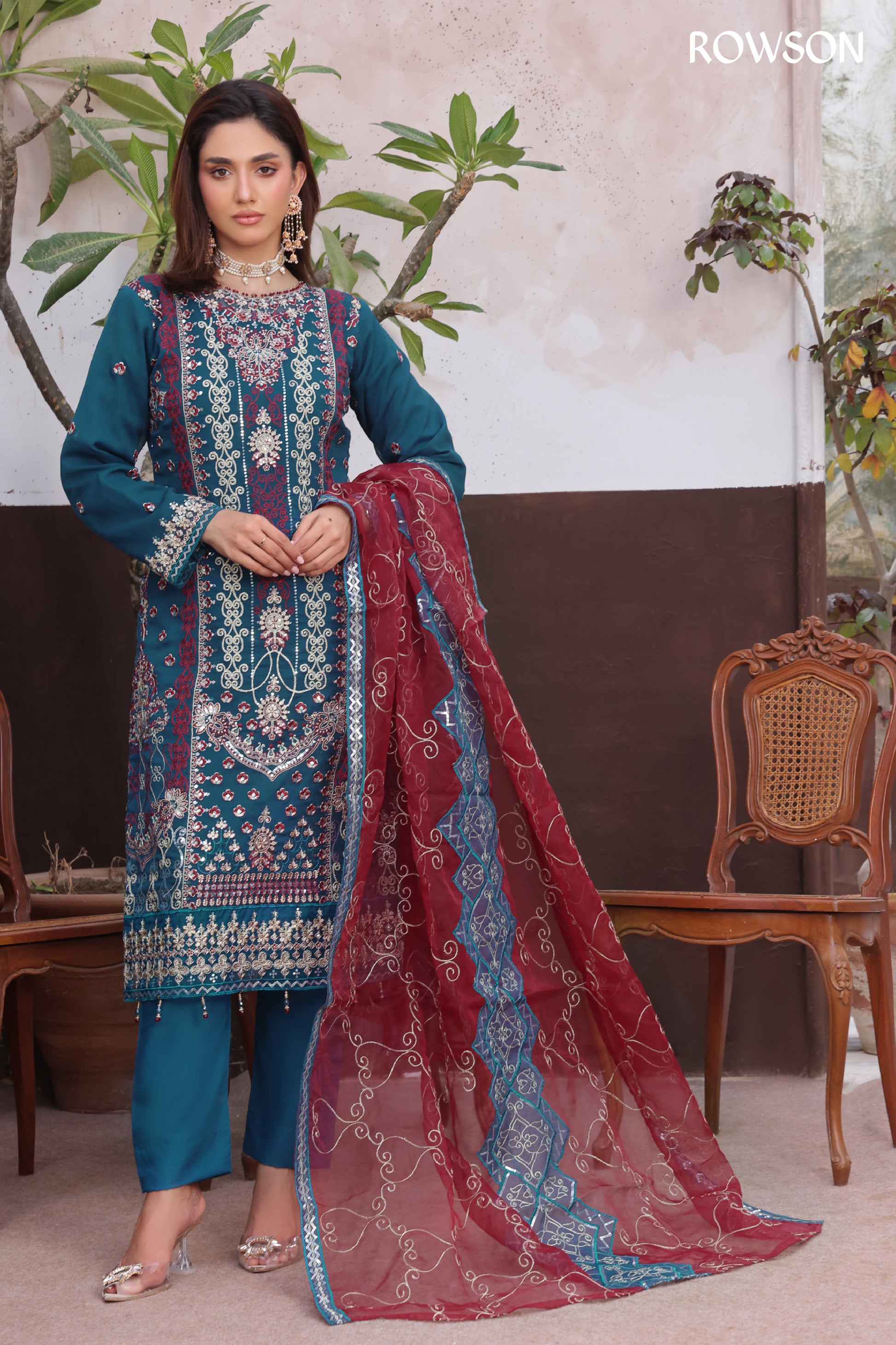 A stunning Pakistani 3 piece set designed for timeless elegance. Featuring heavy intricate embroidery, embellished neckline, full embroidered sleeves, matching dyed trouser, and a beautifully detailed soft net/organza dupatta - This outfit delivers a true royal festive look.