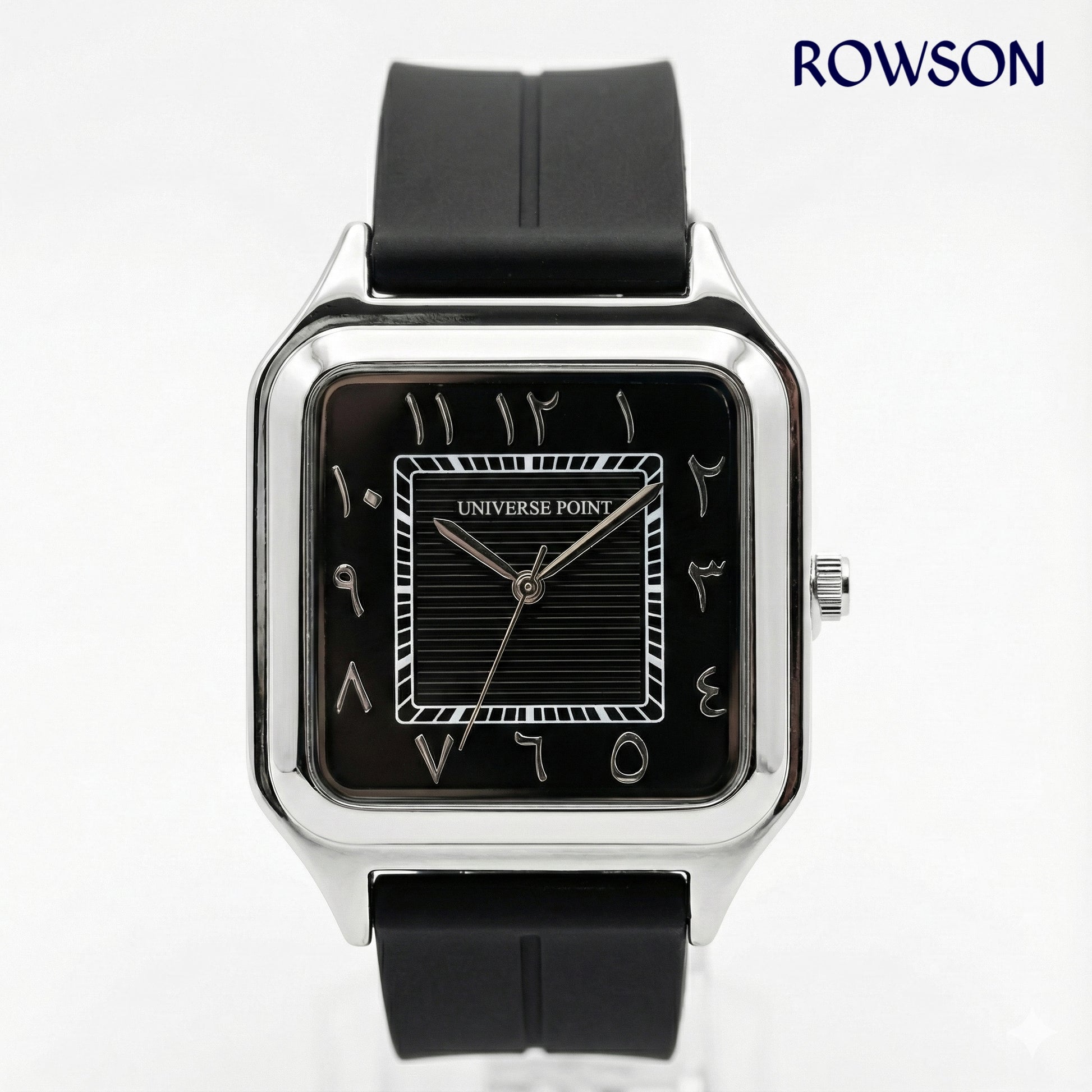 The Universe Point Arabix Silver Watch blends modern minimalism with a unique Arabic numeral design, making it a standout choice for everyday style. Featuring a sleek square silver case and a bold black dial with Arabic indexes, this watch offers a refined yet contemporary look.